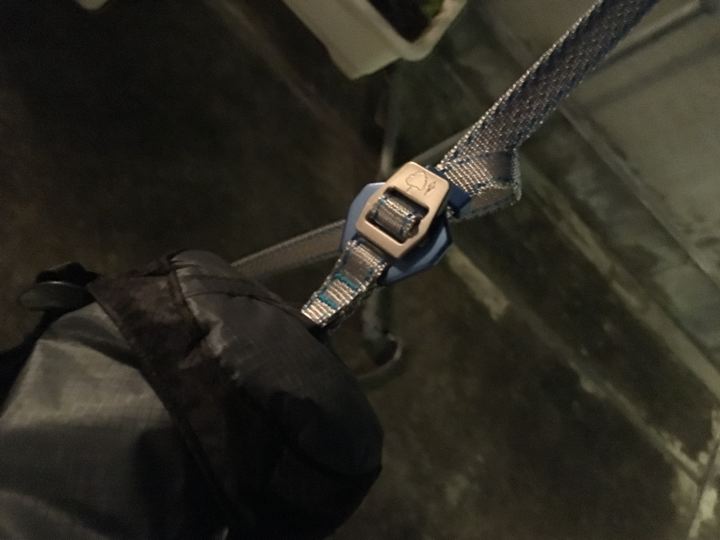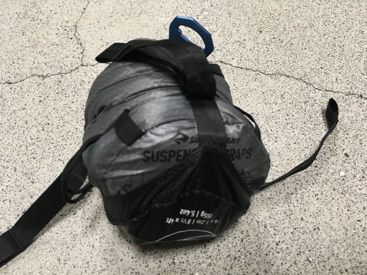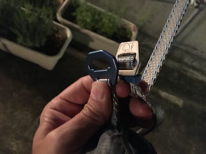 ならばミノムシ型とか。この様に後から何かハンモックに通したい時にはストラップの金物を一旦ちょこっと外すだけなので非常に便利です(ヘネシーだと結び直し)