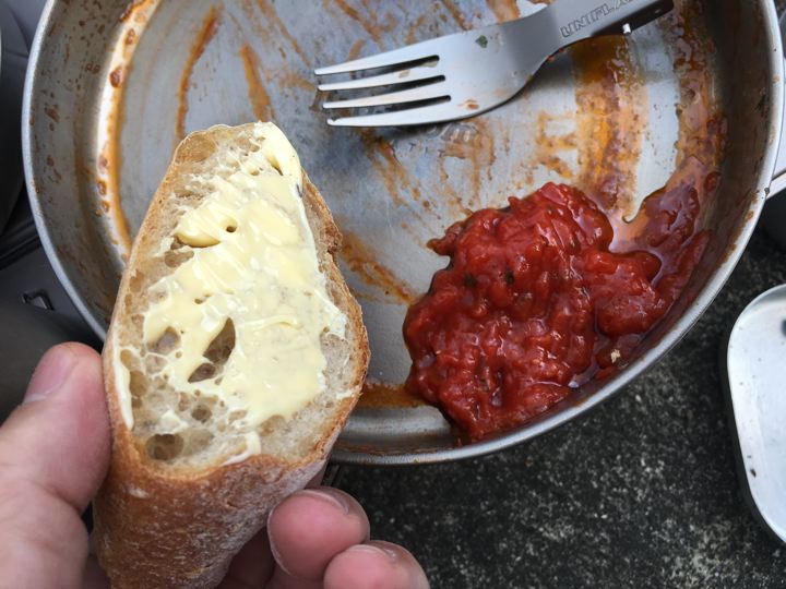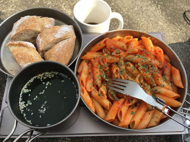 ランチはペンネアラビアータとバゲット。うみゃ〜!