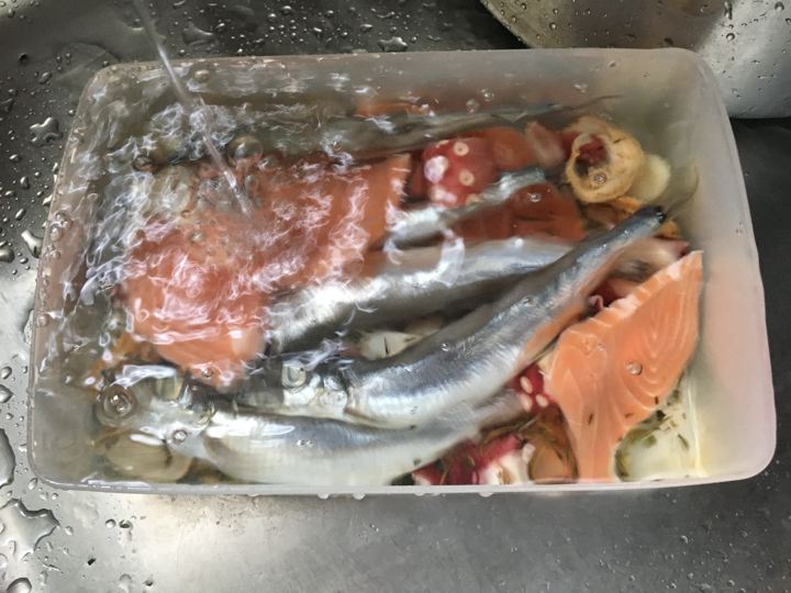 1日ソミュール液に浸したので、真水で洗い落とします。めんどくさいなぁ。