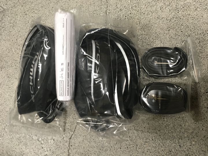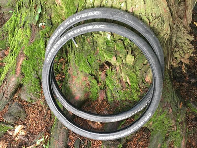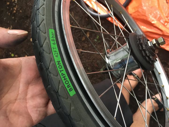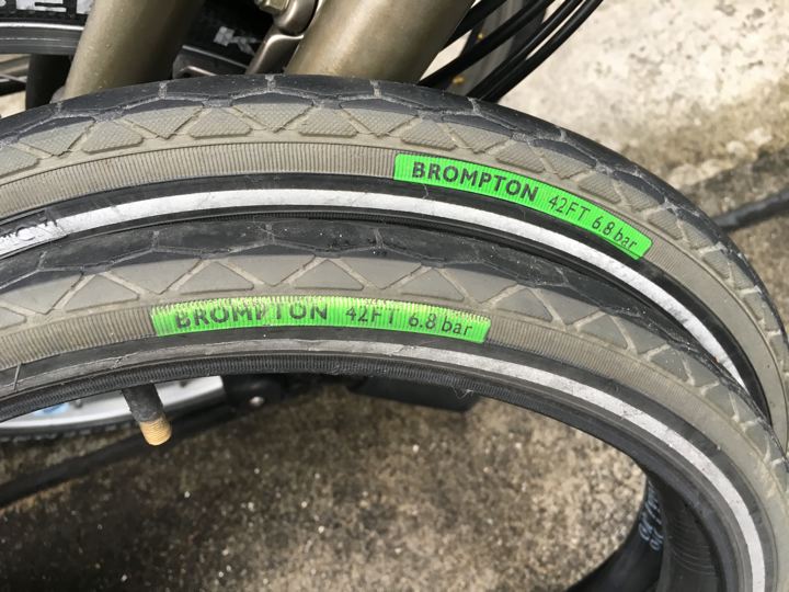 リョウさんに勧められて交換した、ほっそいスパゲッティタイヤがあっとゆ〜まにぼろぼろになったので、責任とって交換してもらうべく飾っておいたBROMPTON純正ノーマルタイヤを持って行きました。今見るとグリーンの部分がかっこいいね。
