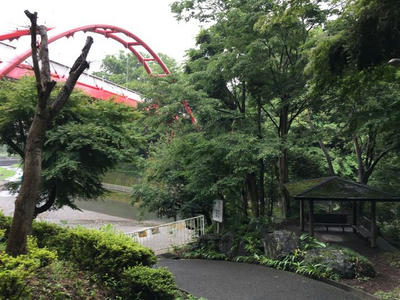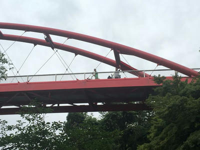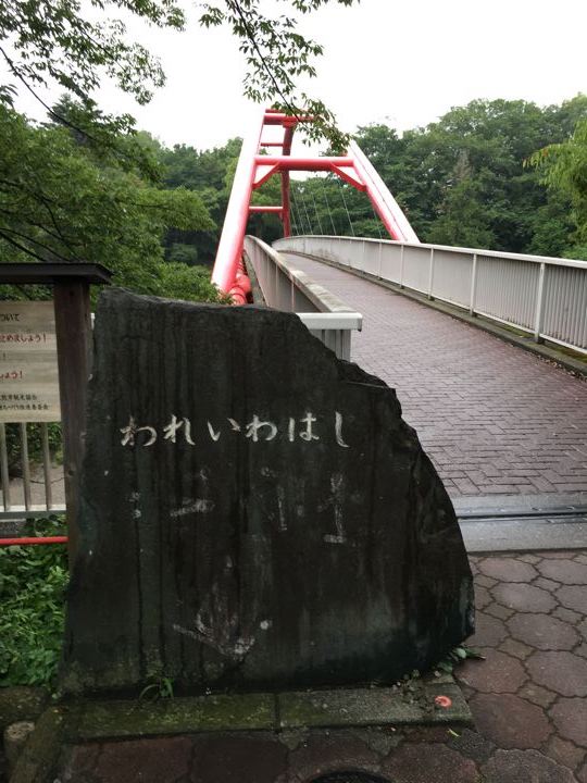 赤いわれいわ橋を渡って、急な下り坂を降ります。