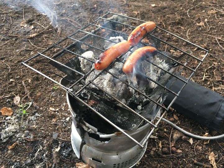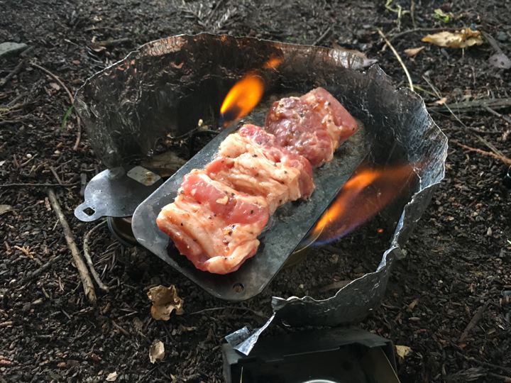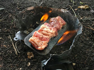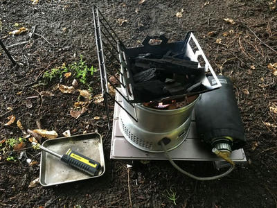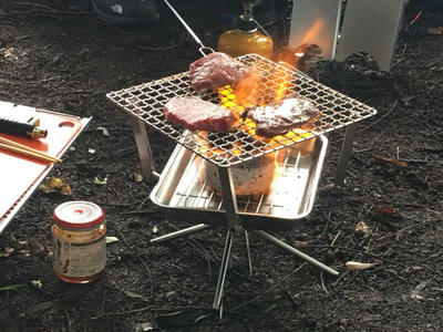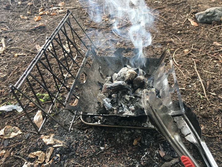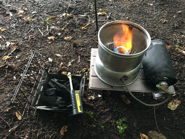 で、いつものようにストームクッカーのチャイナガスバーナーにファイヤー!してバーゴのファイヤーボックスグリルに炭入れて、炙ります。