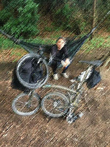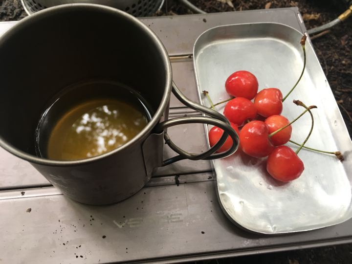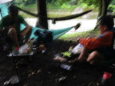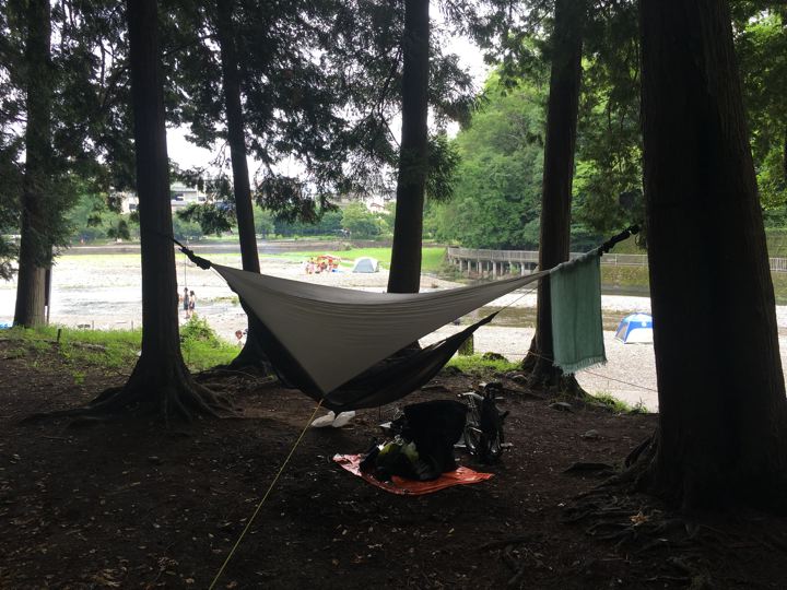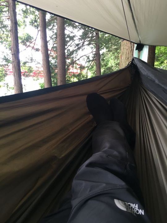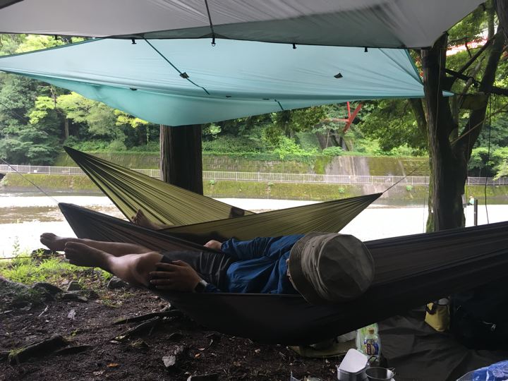 食後は、ヘネシーハンモックから軽量ハンモックへ移行しつつあるハンモック自慢へ。
