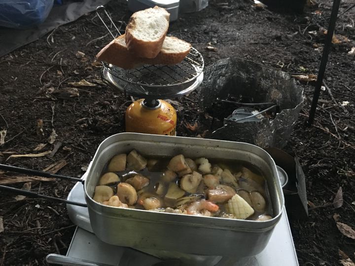 メスティンで久々のアヒージョ!もちろんバゲット付。う、うみゃ〜!