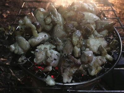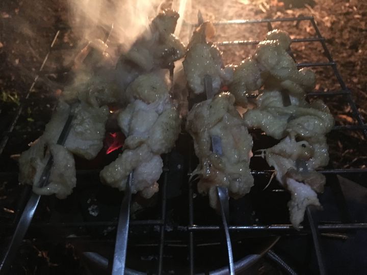 ディナーは炭火で焼鳥焼いて、うみゃ〜!知らぬ間に、ばたんQ