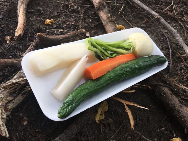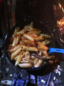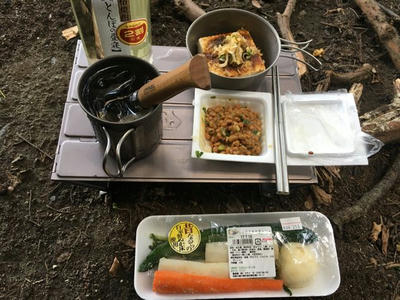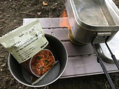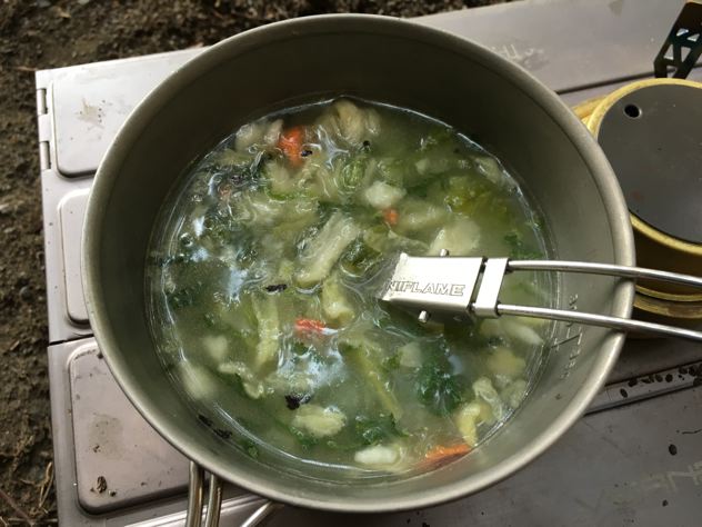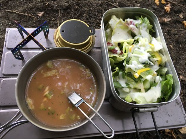 ランチは、アルコールストーブで軽〜くインスタントパスタとサラダ。