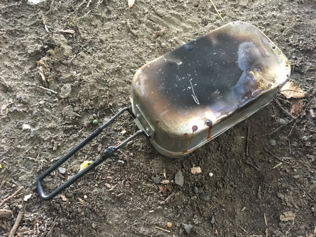 炊けたみたいなので、ひっくり返して10分蒸らします。メスティン真っ黒〜!