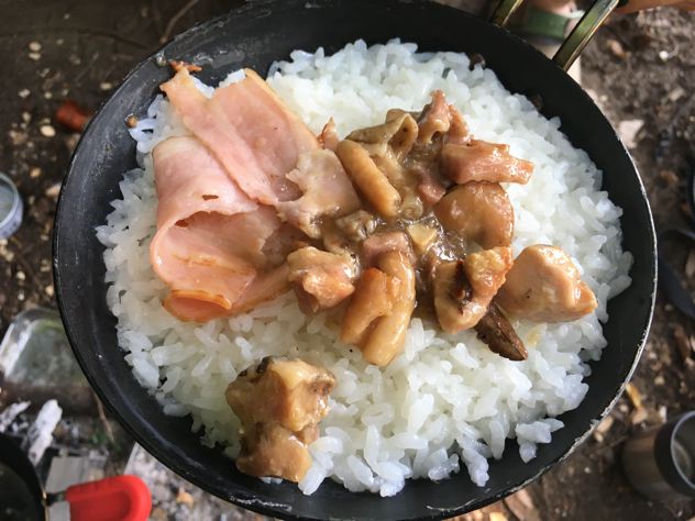 しびれゔぁ!ご飯もフライパンで焚いてました。謎〜!