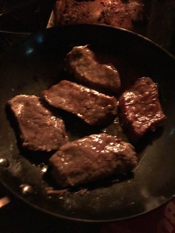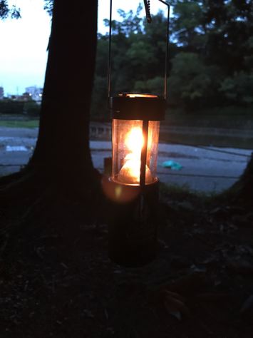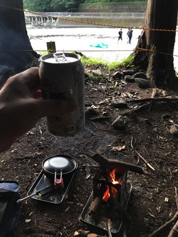 そして、ちゃんと焚火台の下にはステンレストレー敷いてる。地面へのダメージを回避する本物のアウトドアマンなのか?焚火台は、笑’sのなんちゃらがどうちゃらって言ってたな。クッカーは相変わらず蓋付きのちびパンのみ。むむぅ。