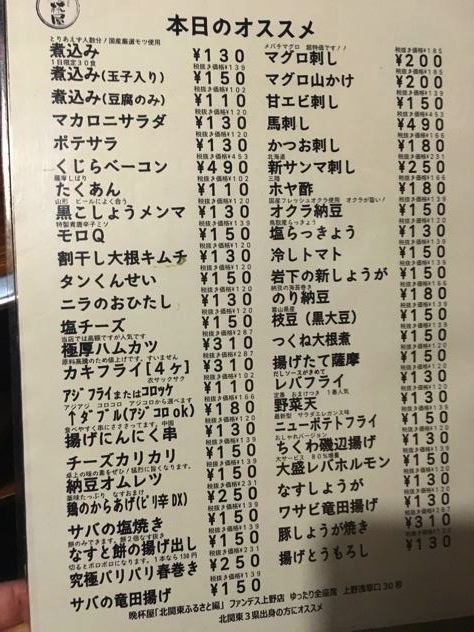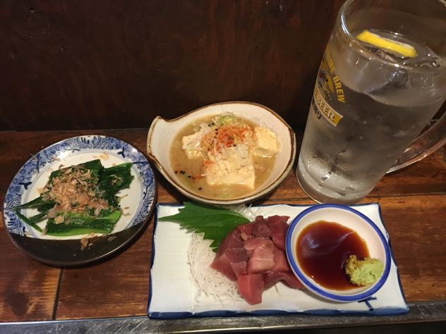 ニラのおひたし130円、煮込み(豆腐のみ)110円、マグロ刺し200円。うみゃ〜!