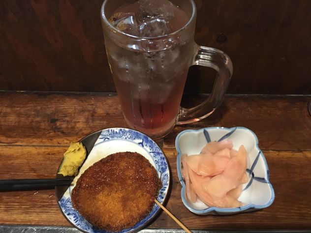 極厚ハムカツ310円、岩下の新しょうが150円。うみゃ〜!