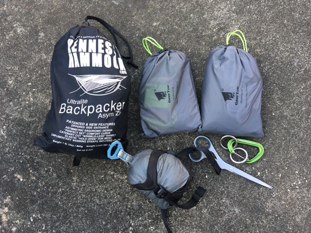 試しにシートゥサミットのウルトラライトハンモックをそのセットで張ってみた。
