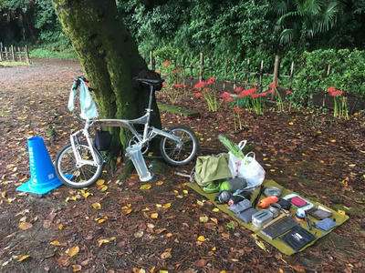 いつものサイトに到着で、いつもの彼岸花にお出迎えされ、広げます。