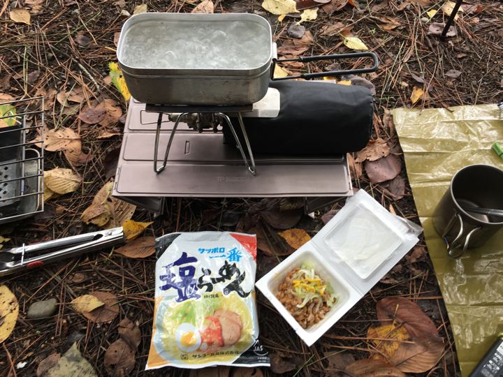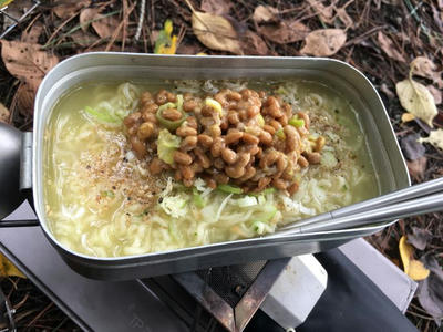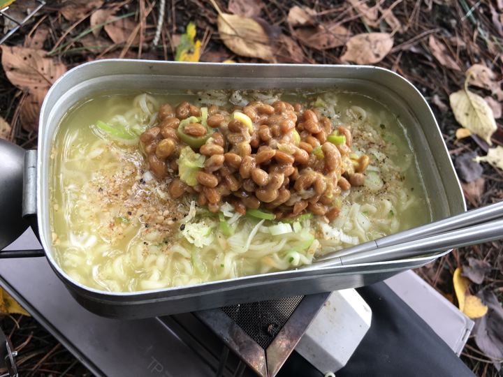 本日のランチは、メスティンで作るサッポロ一番塩らーめん。納豆入り。うみゃ〜!
