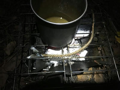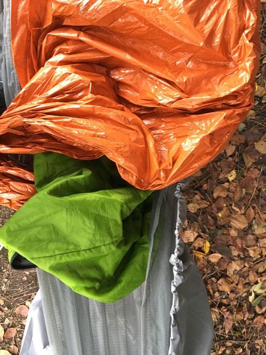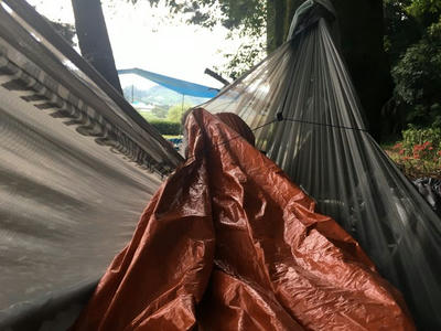 この日の寝具は、下からハンモックウオーマー、エマージェンシービビィ、イスカ夏用シュラフのみ。問題なし。(例によってエマージェンシービビィは結露しますが・・・)
