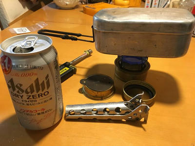 トランギアのアルストの上にエバニューのチタン五徳乗っけて、スライドガストーチでファイヤー!ノンアルビール飲みながらしばし待ちます。