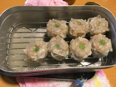 メスティンにお水ちょこっと入れて底網敷いて、スーパーで買ってきた既製品の焼売を並べます。10個ぴったり〜!