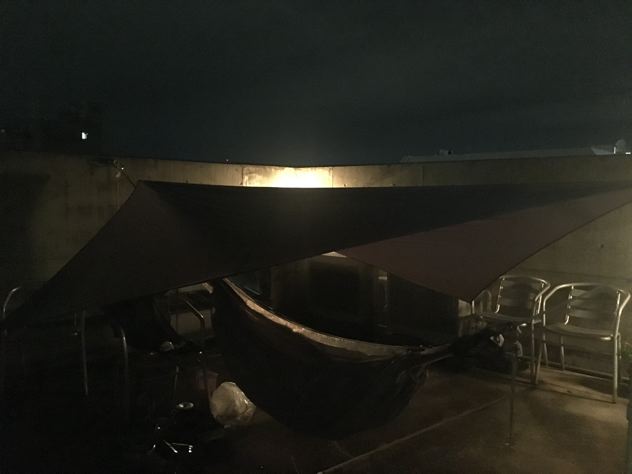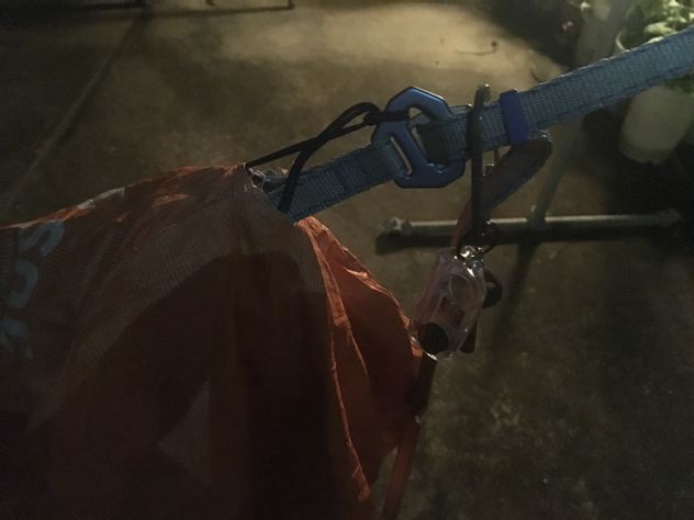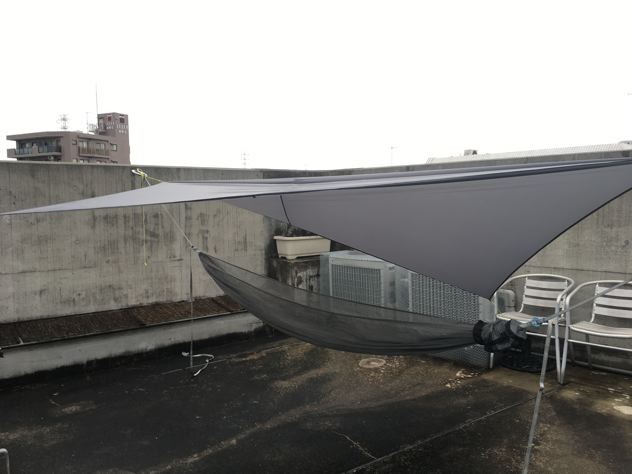 背中が寒くなってきたので穴あきハンモックウォーマーをセット。小さい穴だから効くじゃろ。