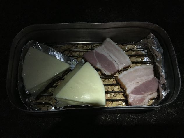 燻製専用メスティンにアルミホイル敷いて燻製も開始。