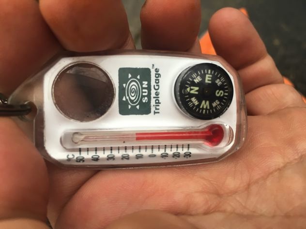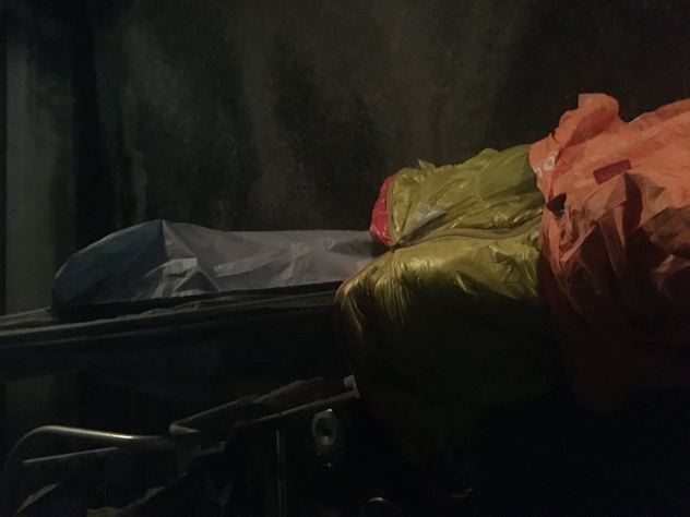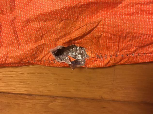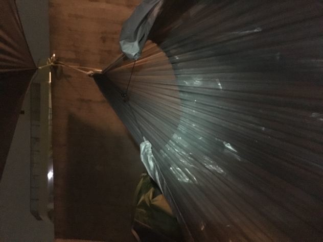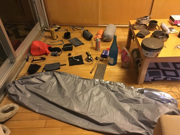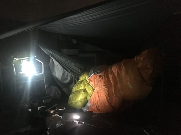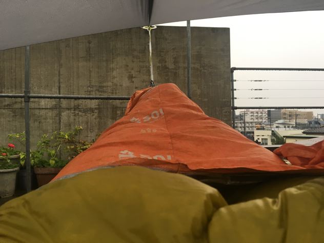 この日の寝具は、モンベルシュラフ#2のミノムシで実験。雨が心配だったのでシュラフカバーを兼ねてエスケープライトビビィもかぶせる事に。考える事数10分。ミノムシだとビビィに穴を開けないと被せられない事に気がつく。仕方なく穴をあけて貫通。OK!