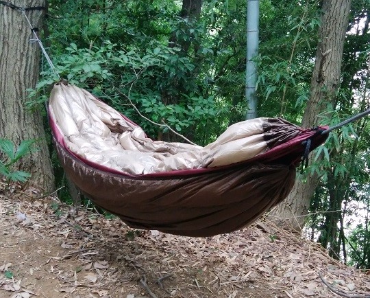 冬キャンプ用に買ったモンベルの女性用ダウンハガー#3。あったかいけど758gと重た。ハンモックだとアンダー側のロフトは潰れてしまうので、どうしてもマットか外断熱するアンダーキルトが必要になってしまいます。ミノムシならばこれだけでもOK。シュラフとしてはさすがモンベルさん。細かい機能と作りが素晴らしいです。