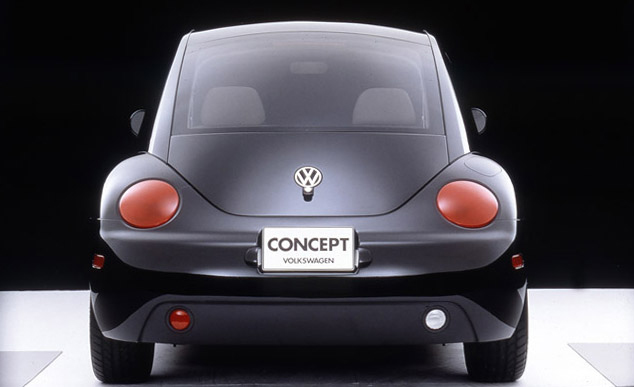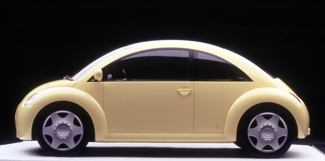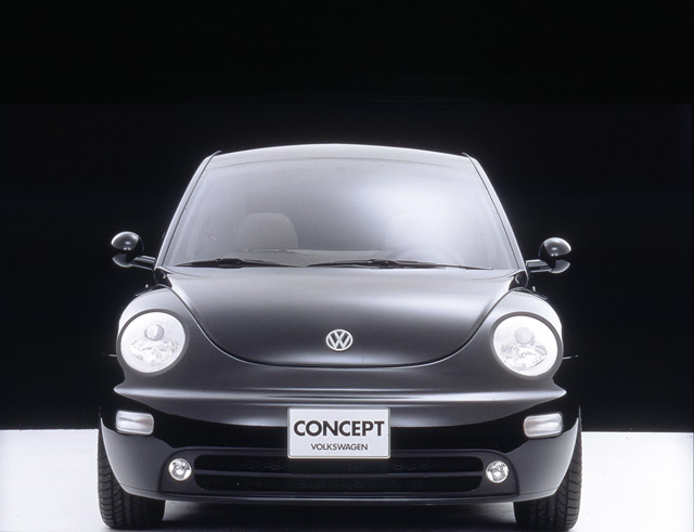 1994年1月デトロイトの北米自動車ショーに「コンセプト1」なる、まさにコンセプトカーが登場。当時北米マーケットで苦戦していたVWが新たに作ったカルフォルニア州シミバレーのデザインセンターで、二人のアメリカ人デザイナー、J ・メイズとフリーマン・トーマス(カルフォルニアのパサディナにある「アートセンター・カレッジ・オブ・デザイン」の出身。J ・メイズはアウディに入社して90年代以降のアウディ車に大きな影響を残したアヴスクワトロのデザインを担当。トーマスは在学中にポルシェからオファーをもらうほど優秀な学生で、後にアウディに移って初代TTクーペのデザインを担当)から「ビートルを新しい時代に蘇らせる」試みとして提案。3つの円弧をモチーフにした厳密な幾何学的デザインは、アメリカ人の皆さんも、しびれゔぁ!で、北米で大絶賛に。その2ヶ月後ジュネーブモーターショーでカブリオ仕様で提案され、これまた、ヨーロッパの皆さんも、しびれゔぁ!なのでした。コンセプト1は、Poloベースのちびっこカーを想定していたみたいなのですが、フロントグリルがついてないので元々は電気自動車かハイブリッドカーをイメージしていたらしく、実際に走る車ではなかった様です。
