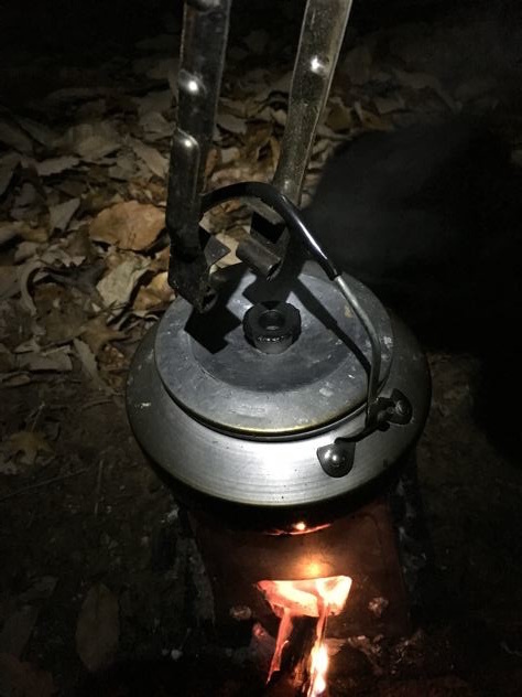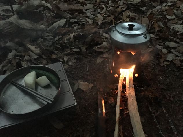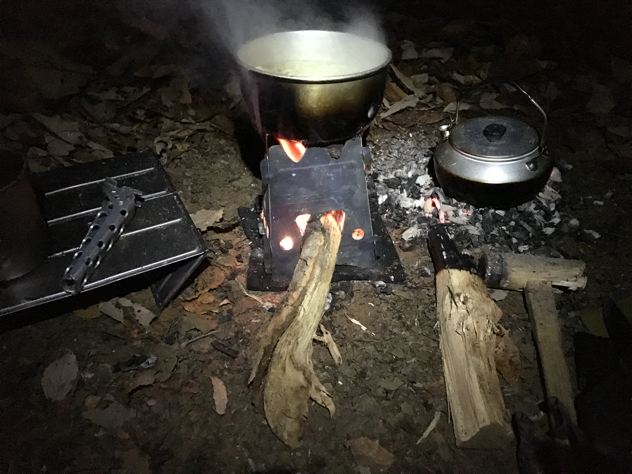 燃料は焚火。やかんも鍋も底が真っ黒け〜(でも、洗えばすぐ落ちる)
