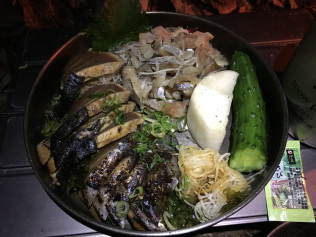 アジのたたきとカツオのたたき。うみゃ〜!(寒くなるとクーラーなしで夜まで刺身がもつから助かります)