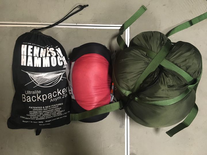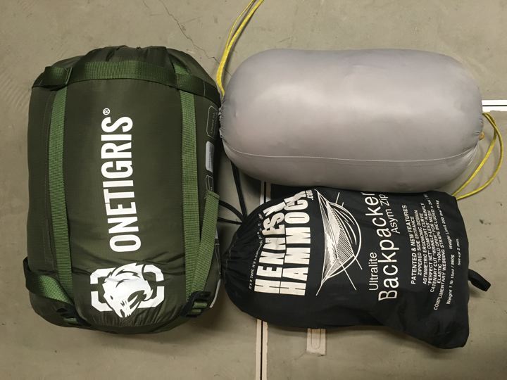 冬用ヘネシーの最強セット。アンダーにワンタイガー、トップはモンベルのダウンハガー#2