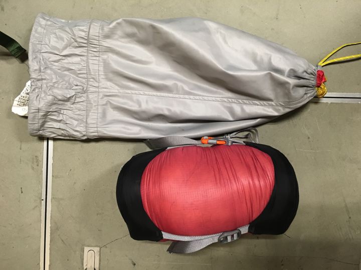 ウインドハードはだいぶ小さくて軽い。モンベルは肌触りと寝心地がいいですけどね。イヒヒ