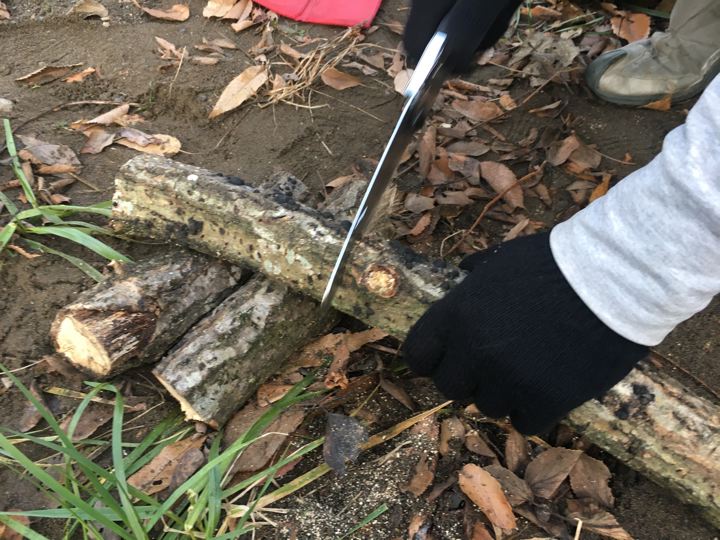 ノコでカットしてから、自分の愛用両刃ナタでバトニング!