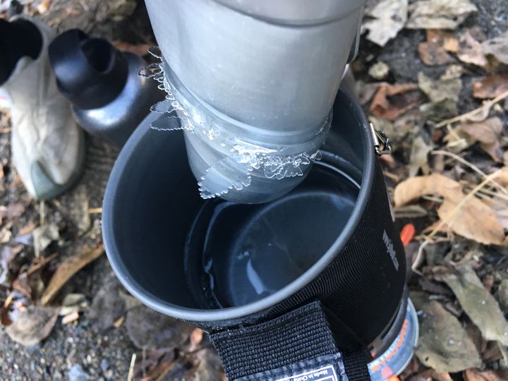 たぁさんが「しびれゔぁ!」昨夜ジェットボイルで熱燗やってた潰しアルミカップが凍ってます!