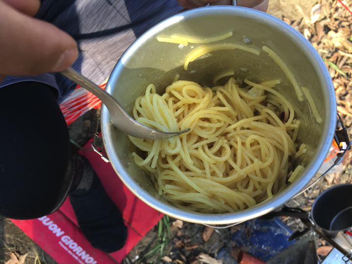 たぁさんは、なんかブツブツ言いながらアルミトレックで本格ペペロンチーノ!