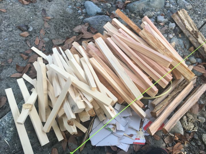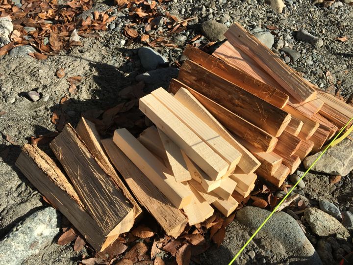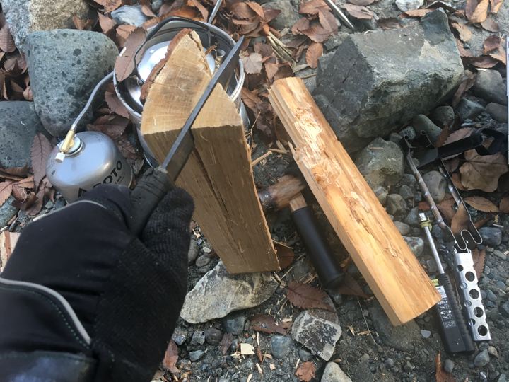 自宅から持ってきた広葉樹の薪とこちらで買った針葉樹の薪を出す。
