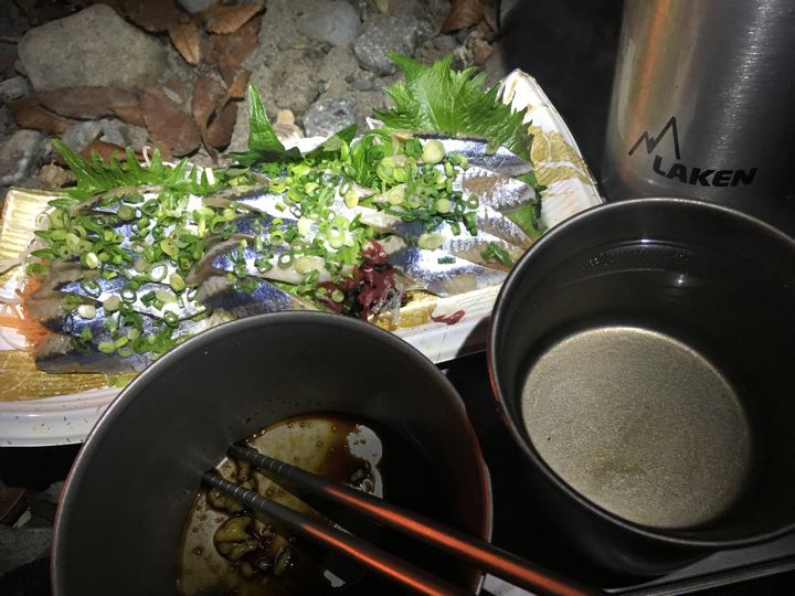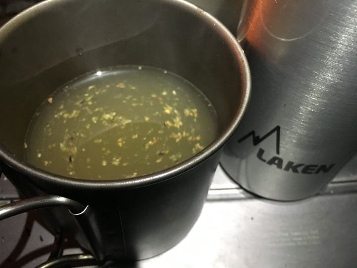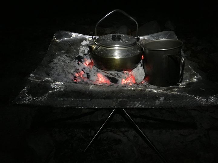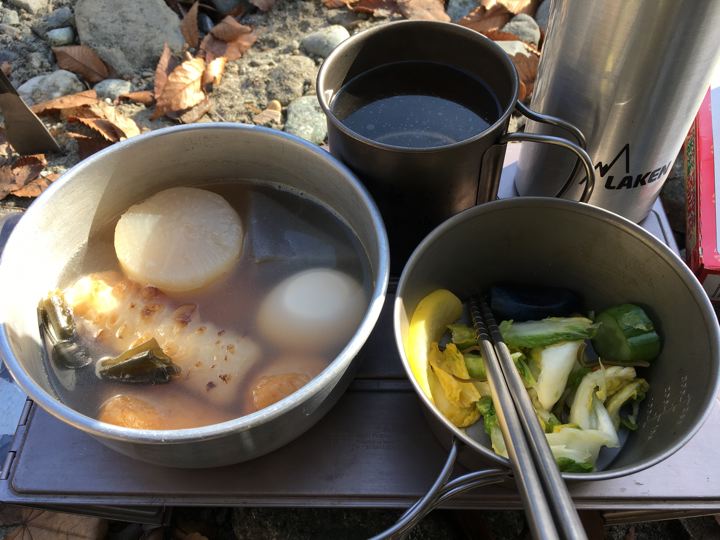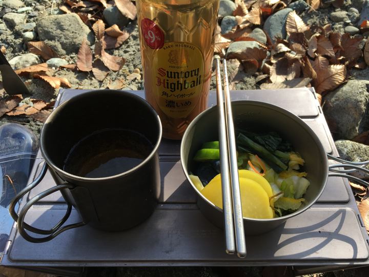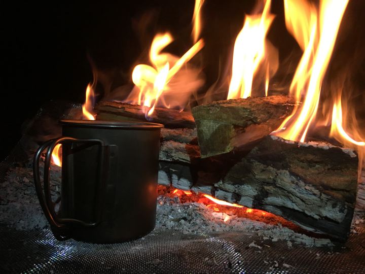 芋焼酎お湯割。チタンマグだから冷めたら焚火で温めます。
