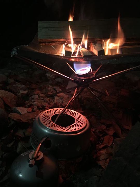 ストームクッカーのBULINバーナーをにょろっと出してファイヤースタンドの脚に挟む。まるで純正品のようにシンデレラフィット!
