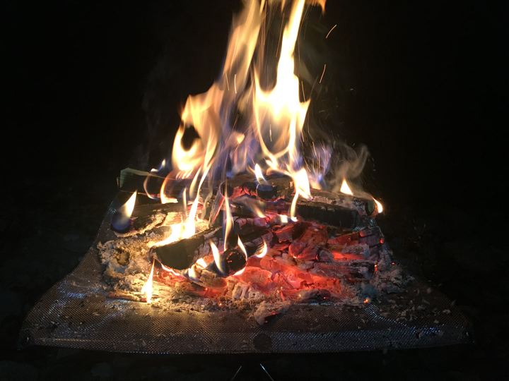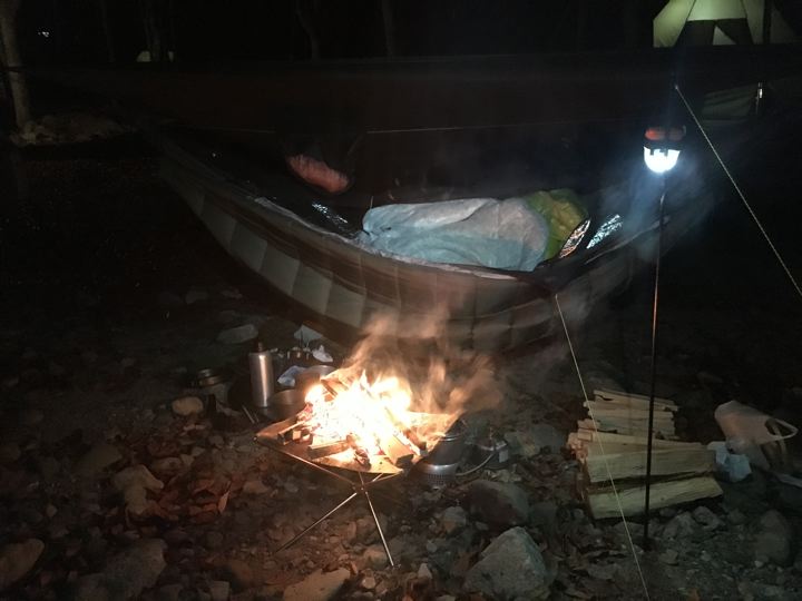 よく燃えて薪によってはハゼたりしますからあまりハンモックやタープの近くは危険かも。(と言いながらかな〜り近い。笑)