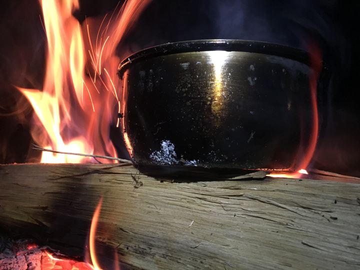 焚火だと鍋が超真っ黒けに。(しかし、ススだから洗えば簡単に落ちます)