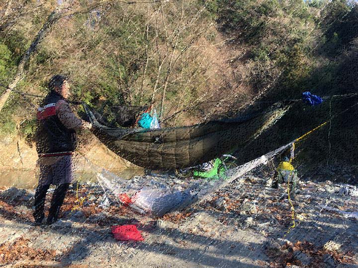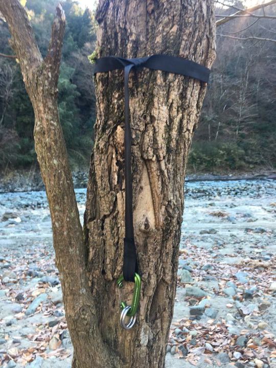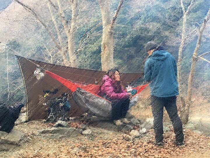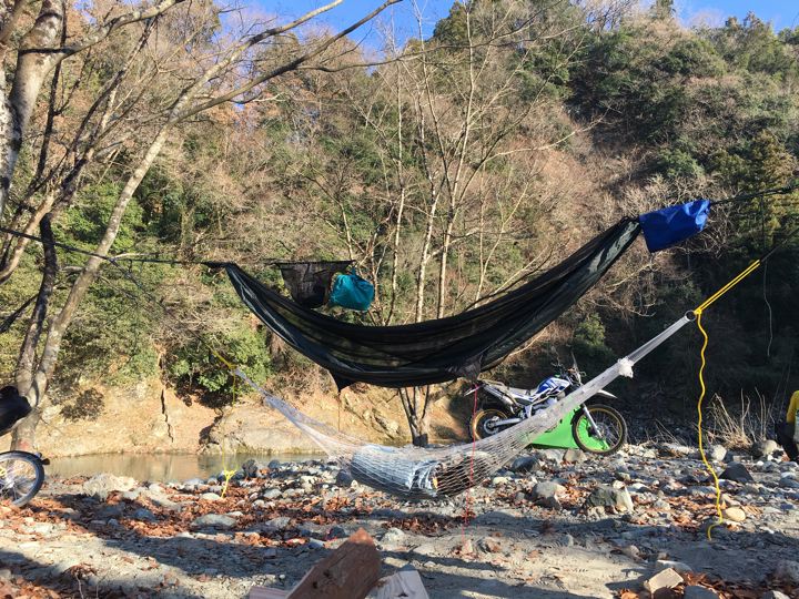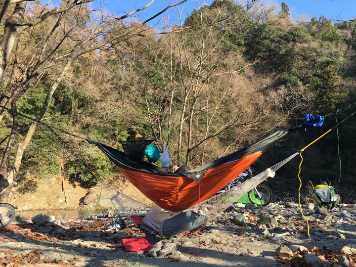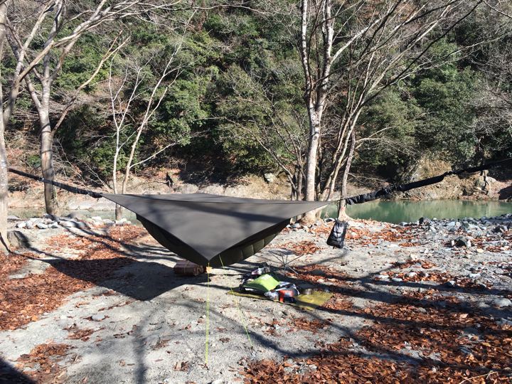 エマージェンシーシートで自作のハンモックウォーマー挟んで・・・