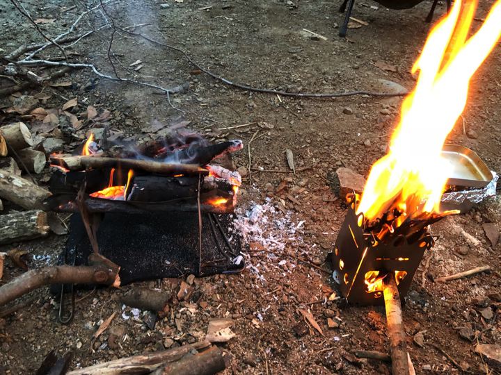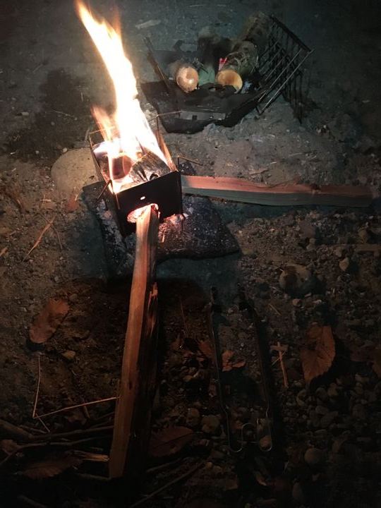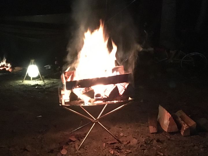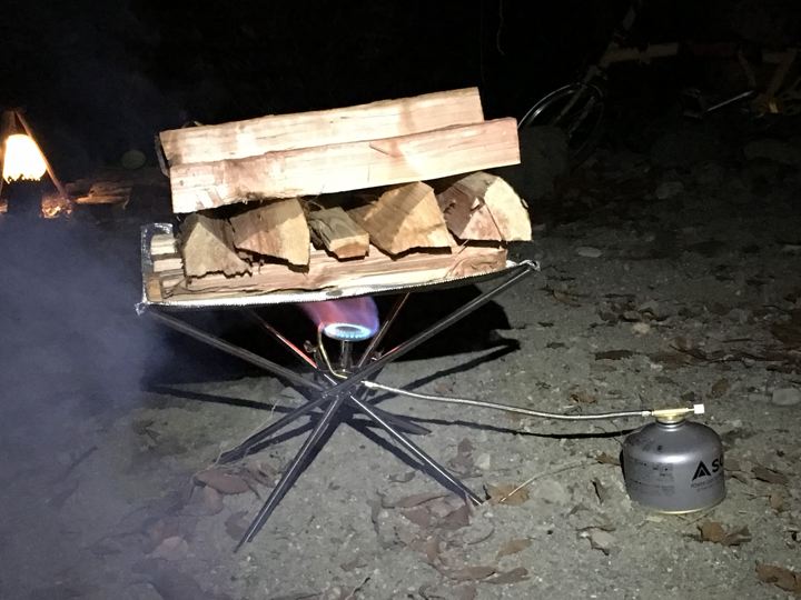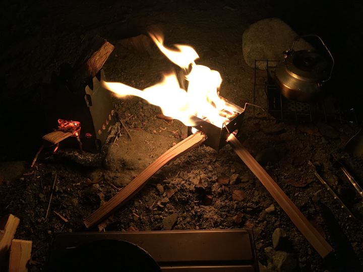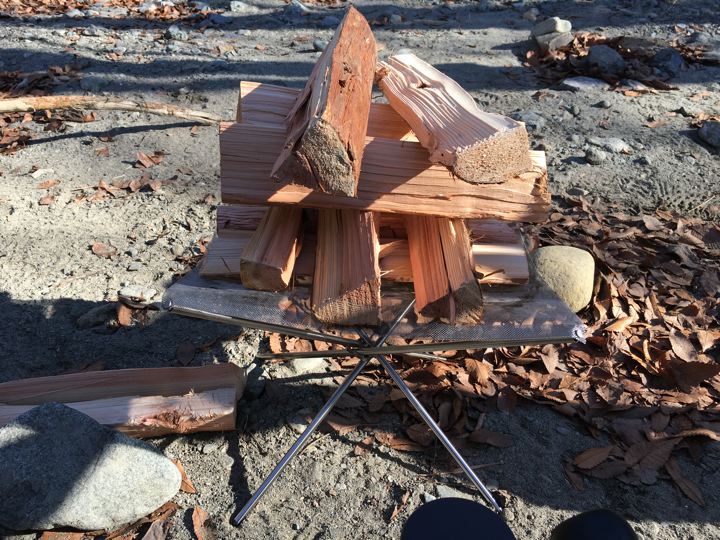 今回も夜の暖房用にユニフレームのファイヤースタンド2を持参。