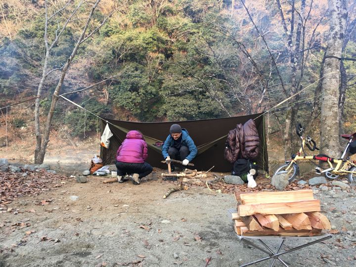 イノウエ夫妻は仲良く焚火の準備。夫婦でのキャンプは理想的ですね。(うちのおか~も来ればいいのに〜→絶対こない)
