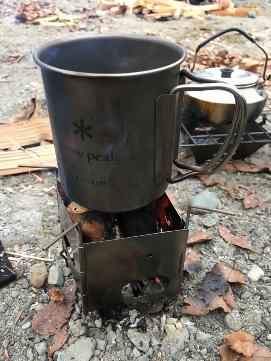 イノウエさんはいつものソラチタニウム。横置き型では最小最軽量でしょうか?よく燃えてます。