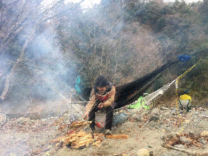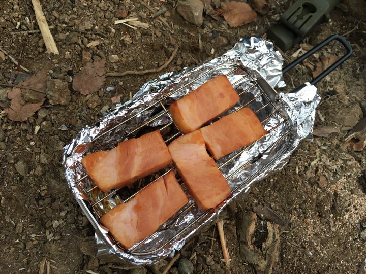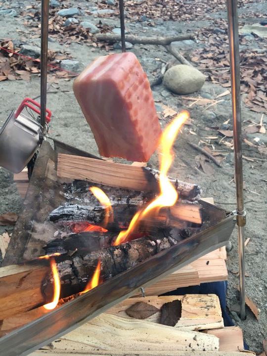 たぁさんは謎のトライポッドの自作焚火台で厚切りベーコンを焼きます。