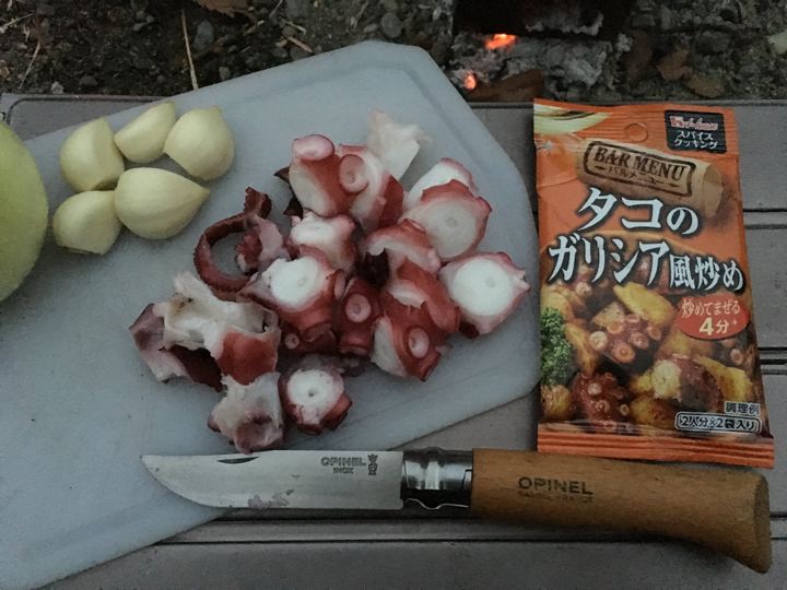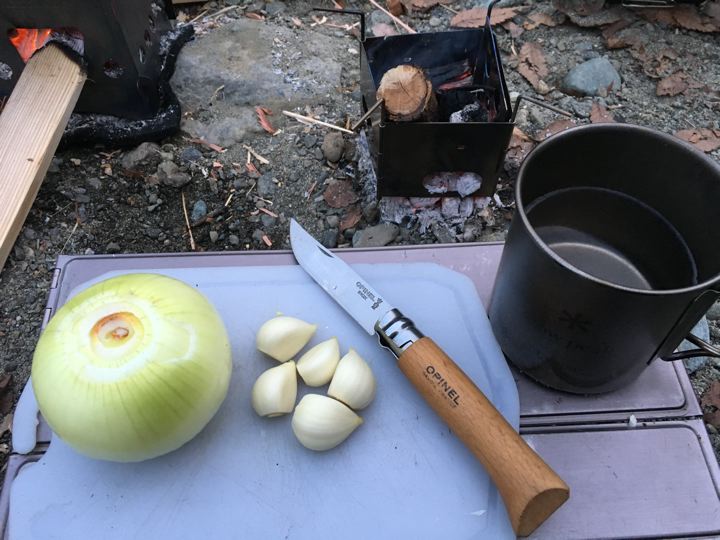 追加おつまみを作ります。ニンニク玉ねぎをオピネルでカット。