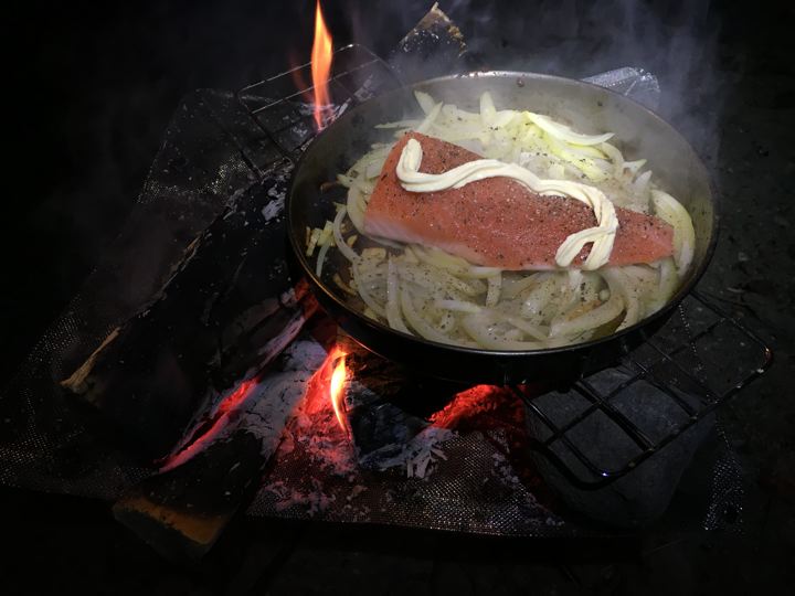 ファイヤースタンドの焚火で、メインのサーモンソテー。うみゃ〜!