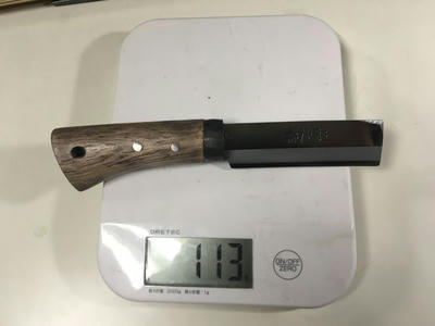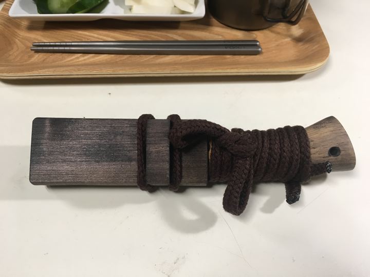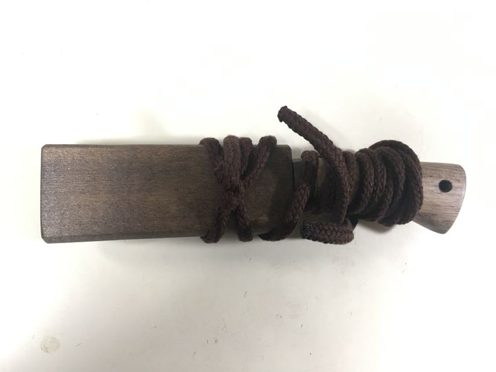 高知の豊国鍛工場さんの、ミニ腰鉈 75 両刃 白鋼 磨 樫柄 木鞘紐付 mini-101