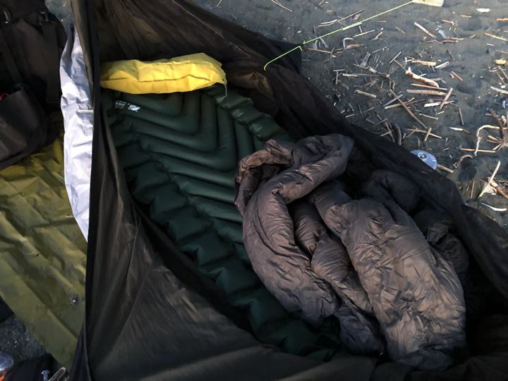 今宵の寝床はこんな感じ。グランドシート敷いて、ハンモックウォーマー挟んで、ヘネシーハンモック。上はクライミットのエアマットにモンベルとアテパのダウン。エア枕も久々の登場。