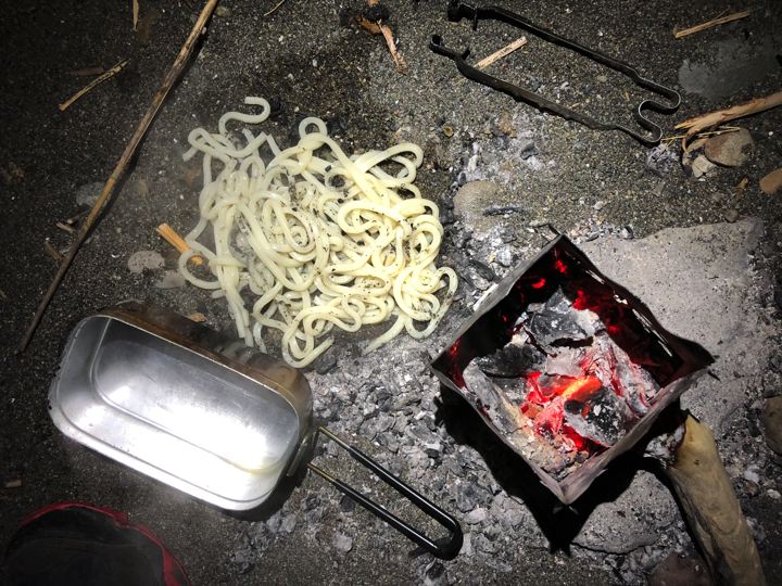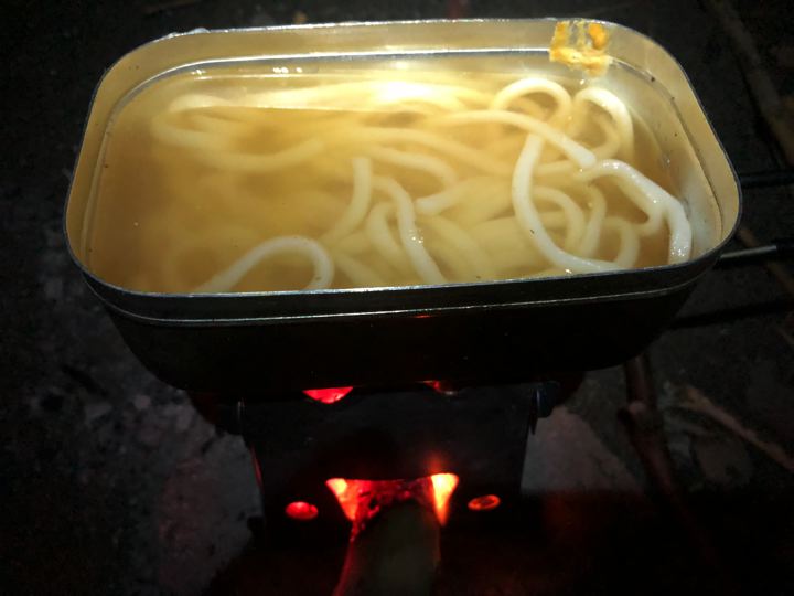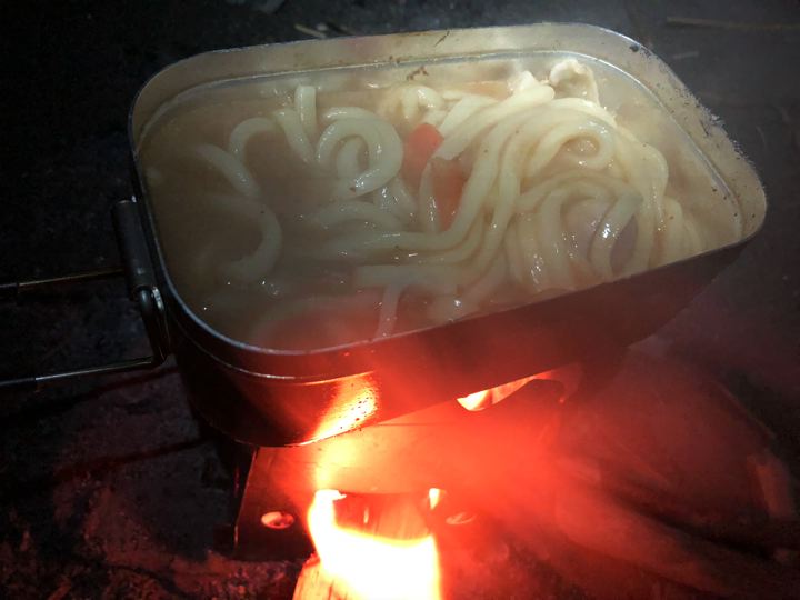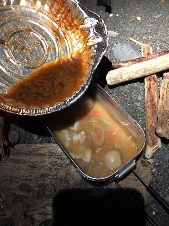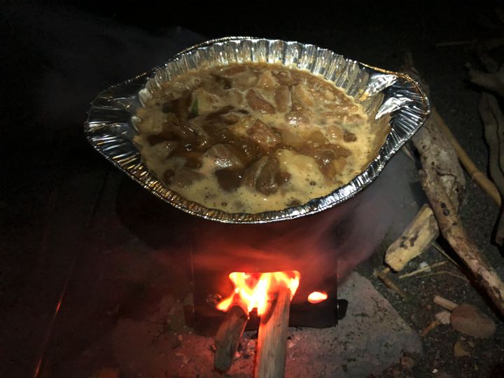 早速焚火で例のホルモン鍋。寒いから助かります。う、うみゃ〜!(痛風的にはヤバい)