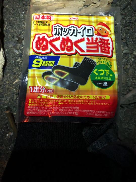 既に気温は1度。例のホカロンを足先に張ります。