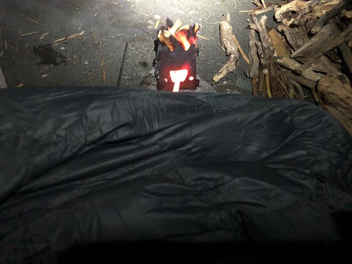 地べたにあぐらかきながらアテパのダウンキルトを体に巻きつけて寒さを凌ぎます。